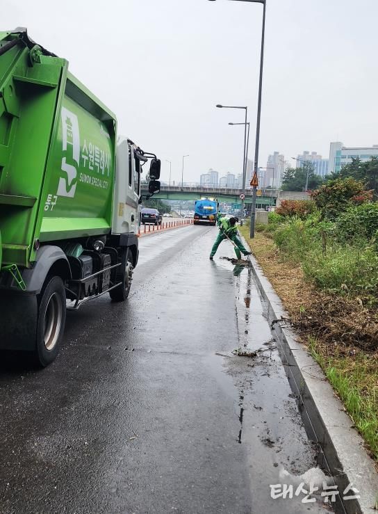 태산뉴스 이동욱 기자 | 수원특례시 영통구는 '대한민국 새단장' 캠페인의 일환으로 민족 최대의 명절 추석을 맞아 고향을 찾는 귀성객들에게 쾌적하고 안전한 도로 환경을 제공하고자 영동고속도로 동수원나들목 진출입로 집중 환경정비를 실시했다.