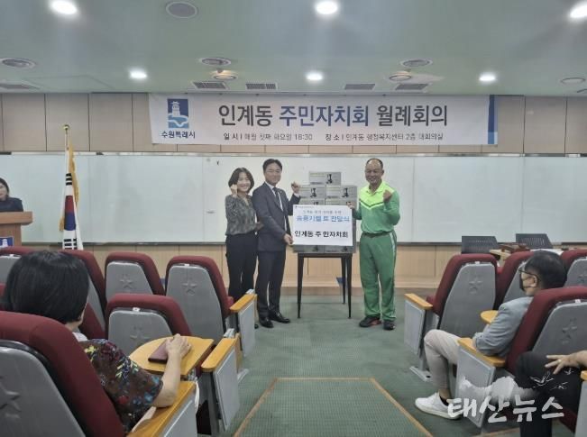 태산뉴스 이동욱 기자 | 수원시 팔달구 인계동 주민자치회는 지난 10월 1일, 가을철 관내 낙엽청소용 송풍기 벨트(100만 원 상당)를 인계동 행정복지센터에 전달했다.