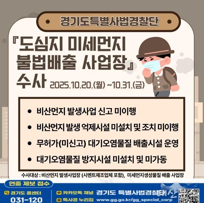 태산뉴스 김준수 기자 | 경기도 특별사법경찰단은 오는 20일부터 31일까지 2주간, 도심지 내 미세먼지 주요 발생 사업장을 대상으로 불법행위를 집중 수사한다.