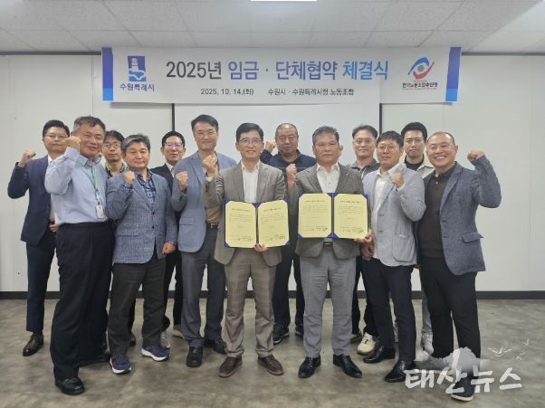 태산뉴스 이동욱 기자 | 수원특례시는 14일 수원시청 노동조합(환경관리원)과 ‘2025년 임금 및 단체협약’을 체결했다.