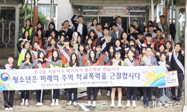 태산뉴스 이동욱 기자 | 수원시 영통구는 14일 동수원중학교 정문에서 법무부 청소년범죄예방위원 수원지역 영통지구위원회(이하 ‘범방위’, 회장 이윤희)와 동수원중학교 재학생, 교직원, 학부모회 등 50여명이 참여하여 ‘등굣길 청소년 선도 캠페인’을 실시했다.