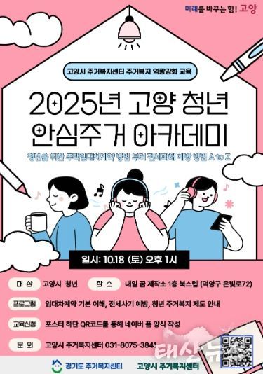 태산뉴스 이동욱 기자 | 고양특례시는 청년층의 안정적인 주거생활을 지원하기 위해 오는 10월 18일 13시 내일꿈제작소(덕양구 은빛로 72)에서 ‘2025 고양청년 안심주거 아카데미’를 개최한다고 밝혔다.