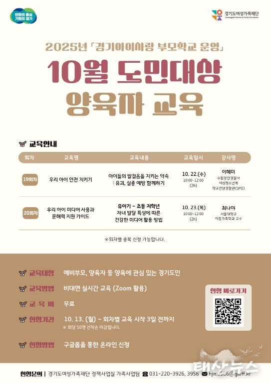 태산뉴스 김준수 기자 | 경기도여성가족재단은 오는 22일 오전 10시부터 12시까지 도내 양육자와 예비부모를 대상으로 실종·유괴예방 온라인 교육을 실시한다.