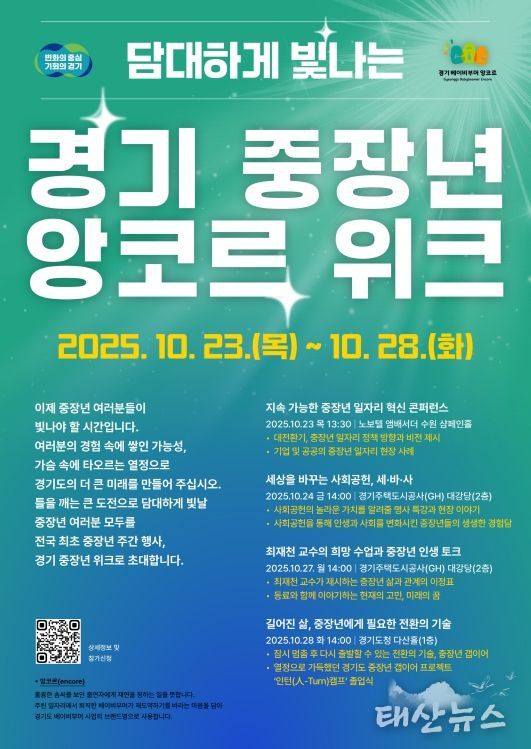 태산뉴스 김준수 기자 | 경기도가 중장년 세대의 도약과 성장을 지원하기 위해 23일부터 28일까지 6일간 ‘경기 중장년 앙코르 위크(week)’을 개최한다.