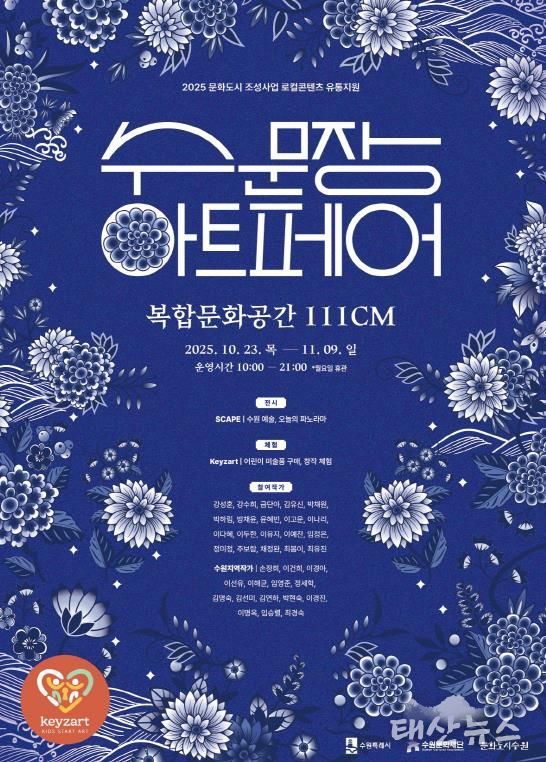 태산뉴스 이동욱 기자 | 수원문화재단은 2025 문화도시 조성사업 로컬콘텐츠 유통지원 ‘수문장 아트페어’를 오는 10월 23일부터 11월 9일까지 18일간 복합문화공간 111CM에서 개최한다.