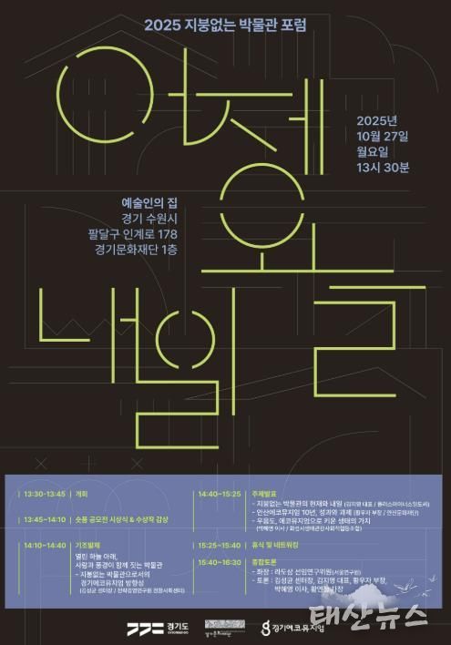 태산뉴스 김준수 기자 | 경기도와 경기문화재단은 일상 곳곳의 발자취를 ‘박물관’으로 만드는 지붕없는 박물관(경기에코뮤지엄)사업의 '2025 지붕없는 박물관 포럼_어제·오늘·내일'을 10월 27일 오후 1시 30분 경기문화재단 예술인의 집(수원)에서 개최한다.