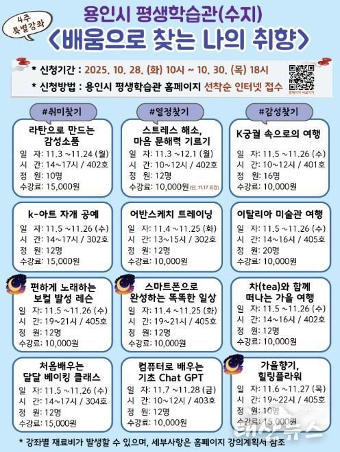 용인시 관계자는 “시민들이 배움의 즐거움을 느낄 수 있도록 실용적이고 유익한 교육 프로그램을 꾸준히 확대해 나가겠다”고 말했다.