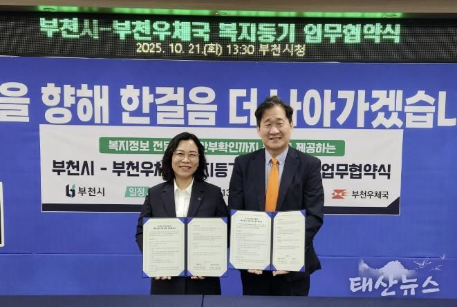 태산뉴스 이동욱 기자 | 부천시는 지난 21일 부천우체국과 ‘복지등기 서비스 지원’을 위한 업무협약을 맺고, 우편배송망을 활용해 복지사각지대를 발굴하고 위기가구를 지원하는 공공협력 체계를 본격적으로 가동한다.