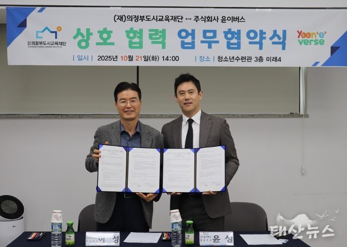 태산뉴스 이동욱 기자 | (재)의정부도시교육재단은 지난 10월 21일 ㈜윤이버스와 ‘AI 기반 영어학습 협력 기반 구축을 위한 업무협약’을 체결했다.