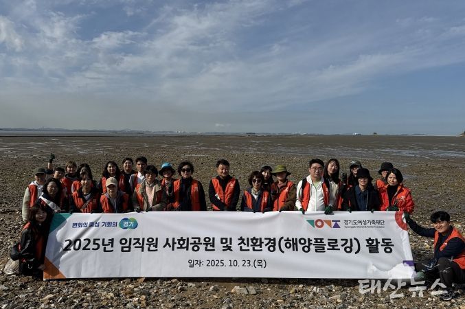 태산뉴스 김준수 기자 | 경기도여성가족재단은 23일 화성시 고온항 및 궁평항 일대에서 임직원 36명이 참여한 가운데 ‘2025년 사회공헌 및 친환경 활동’(해양 플로깅)을 펼쳤다.
