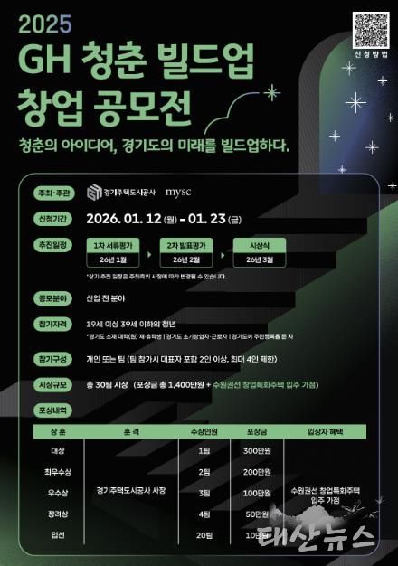 태산뉴스 김준수 기자 | 경기주택도시공사(GH)는 ‘청춘의 아이디어, 경기도의 미래를 빌드업하다!’라는 슬로건 아래, 청년들의 참신한 창업 아이디어 발굴을 위한 '2025 GH 청춘 빌드업 창업 공모전'을 24일 공고했다고 밝혔다.