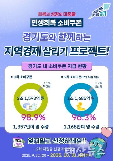 한편 경기도의 지난 1차 소비쿠폰의 지급률은 98.9%로 1,357만여 명이 소비쿠폰 2조 1,593억 원을 수령한 바 있으며, 26일 현재 1차와 2차를 거쳐 지급된 소비쿠폰(약 3조 3,275억 원)의 91.5%가 사용된 것으로 나타났다.