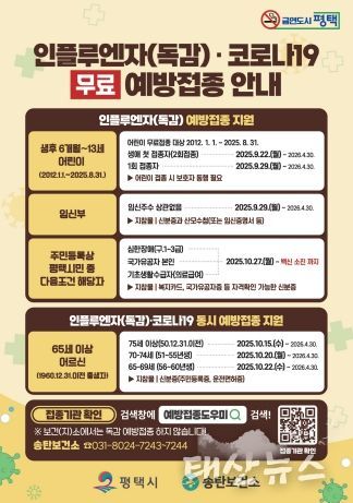 평택시 송탄보건소 관계자는 “인플루엔자 예방접종은 겨울철 건강을 지키는 가장 확실한 방법으로, 특히 면역력이 떨어지는 취약계층은 예방접종을 꼭 받을 것을 권장한다”며 “안전한 접종을 통해 지역사회 내 인플루엔자 감염이 최소화될 수 있도록 적극 노력하겠다”라고 밝혔다.