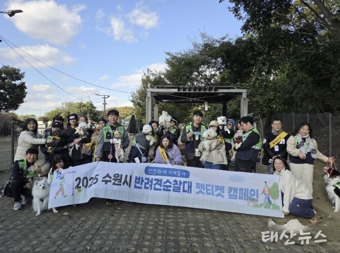 태산뉴스 이동욱 기자 | 수원특례시는 2일 장안·권선·팔달·영통구 주요 반려견 산책지에서 ‘2025년 수원시 반려견 순찰대 펫티켓 준수 캠페인’을 펼쳤다.