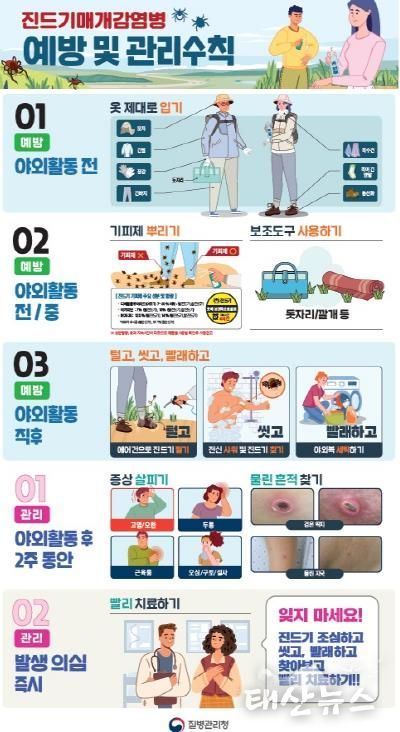 평택시 송탄보건소 관계자는 “가을철은 진드기 활동이 가장 활발한 시기이기에 단풍 구경, 등산, 농작업 등 야외활동 시 한 겹 더 갖춰 입고, 기피제 사용과 귀가 후 샤워만 실천해도 감염 위험을 크게 낮출 수 있다”라며 “야외활동 전·중·후 예방수칙을 실천하고 의심 증상이 있으면 바로 의료기관을 방문해 달라”라고 당부했다.
