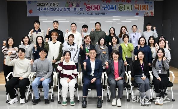 태산뉴스 이동욱 기자 | `25년 11월 10일, 영통구는 영흥수목원에서 사회복지담당 공무원 힐링 프로그램, ‘동(洞)구(區)동(同)락(樂)’을 진행했다. 이 프로그램은 과중한 업무로 인한 정서적 피로와 스트레스를 해소하고 직원들의 심신 회복을 지원하기 위해 마련됐으며, 구/동 직원 30명이 참여했다.