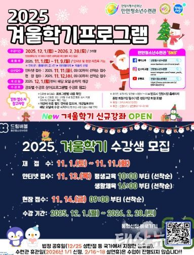 태산뉴스 이동욱 기자 | 안양시청소년재단 소속 만안청소년수련관과 동안청소년수련관은 2025년 겨울학기 강좌 수강생을 모집한다고 12일 밝혔다.