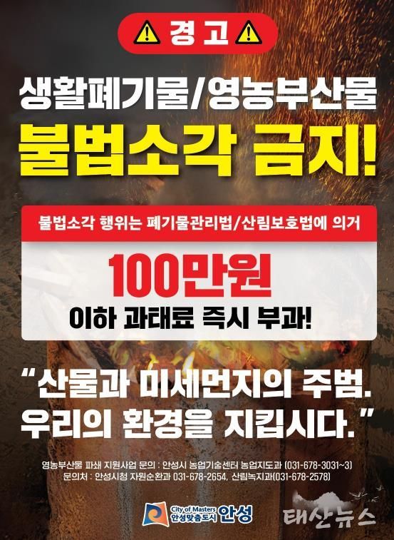 태산뉴스 이동욱 기자 | 안성시가 12월 12일까지 농촌지역 영농폐기물, 생활쓰레기 등 불법소각 행위에 대하여 강력한 단속을 한다고 밝혔다.