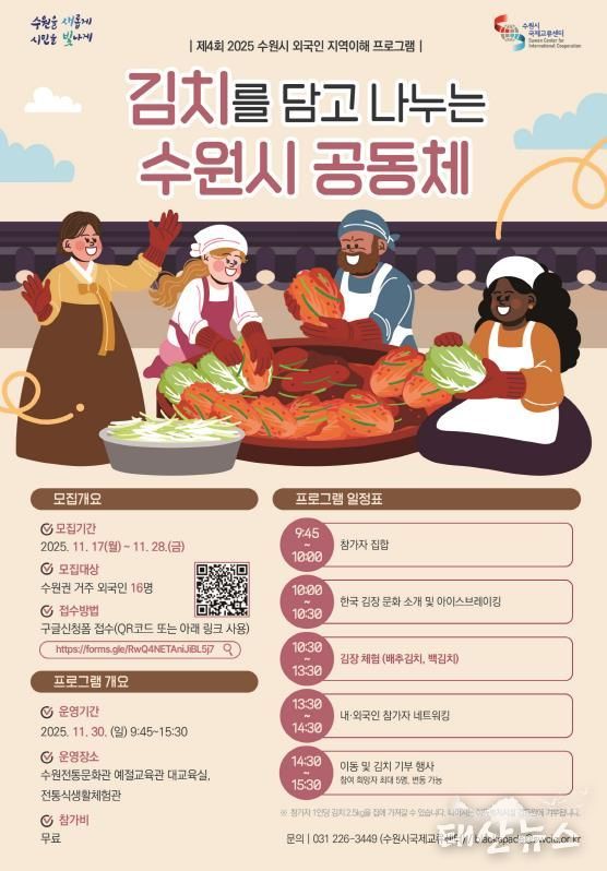 수원시국제교류센터 관계자는 “외국인 주민이 김치를 담그고 기부하며 지역사회 구성원으로서의 소속감을 키우는 데 도움이 될 것”이라며 “한국의 생활 문화와 공동체 정신을 자연스럽게 배울 수 있을 것”이라고 기대했다.