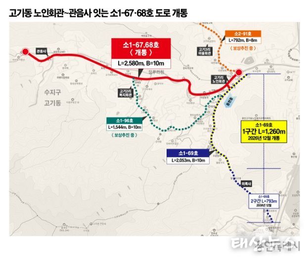 태산뉴스 이동욱 기자 | 용인특례시는 지난 11월 30일 수지구 고기동 노인회관에서 관음사까지 이어지는 도시계획도로 소1-67·68호선(연장 2.58km)을 개통했다고 1일 밝혔다.