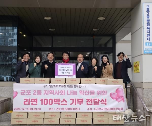 태산뉴스 이동욱 기자 | 군포시 군포2동은 2025년 12월 11일 지역사회 나눔확산을 위한 “라면 100박스 후원물품 기탁식”을 군포2동 행정복지센터에서 개최했다.