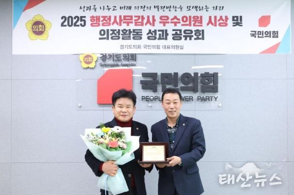태산뉴스 김준수 기자 | 문병근 경기도의회 건설교통위원회 부위원장(국민의힘, 수원11)이 12일 경기도의회 국민의힘 회의실에서 열린 '2025 행정사무감사 우수의원 시상식 및 의정활동 성과 공유회'에서 ‘행정사무감사 우수의원’에 선정됐다. 이번 시상식은 행정사무감사를 통해 도민 중심의 정책 대안을 제시하고, 도정 전반의 운영을 꼼꼼히 살핀 의원들을 격려하기 위해 마련됐다.