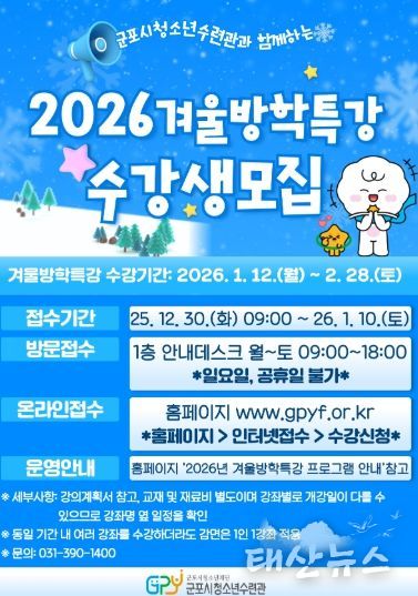 태산뉴스 이지율 기자 | (재)군포시청소년재단 군포시청소년수련관은 2026년 1월 12일부터 2월 28일까지 겨울방학을 맞아 문화·체육 분야 겨울방학특강 프로그램을 운영한다.