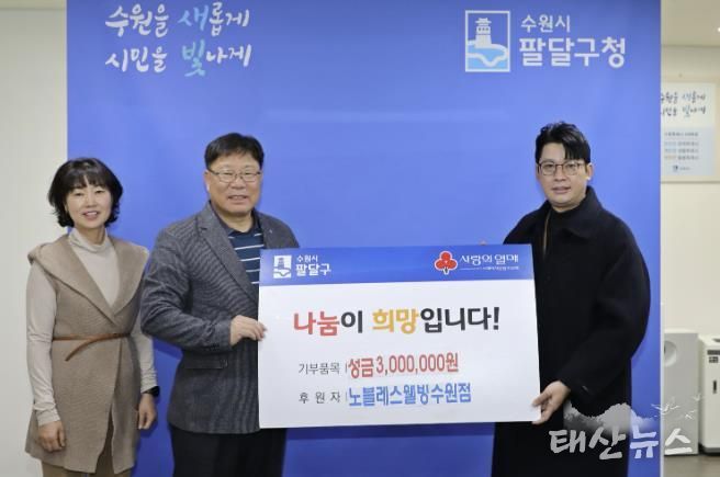 태산뉴스 이동욱 기자 | 수원시 팔달구은 지난 17일, 노블레스웰빙 수원점(대표 김현수)에서 팔달구청을 방문하여 관내 저소득층을 위한 성금을 전달했다고 밝혔다.
