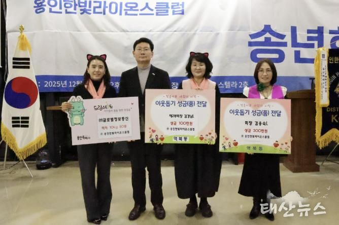 이번 기탁은 용인한빛라이온스클럽의 2025년 송년회를 맞아 마련됐으며, 김용숙 회장(성금 300만 원), 김경님 제2부회장(성금 100만 원), 박은정 회원(백미 10kg 50포)이 참여해 성금 400만 원과 물품을 전달했다.
