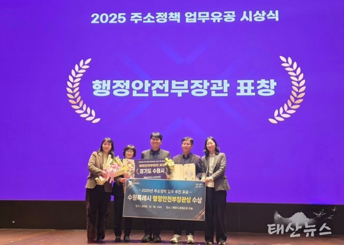 태산뉴스 이동욱 기자 | 수원특례시가 행정안전부 주관 ‘2025 주소정책 워크숍’에서 ‘2025 주소정책 업무 분야 우수기관’으로 선정돼 행정안전부 장관 표창을 받았다. 특별교부세 4000만 원도 확보했다.