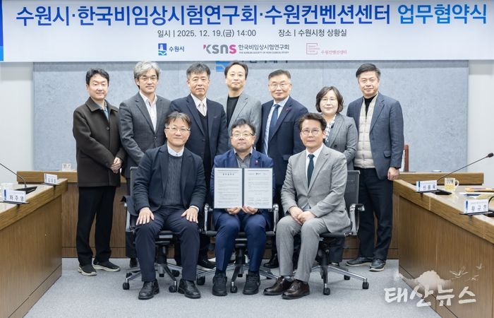 태산뉴스 이동욱 기자 | 수원특례시와 (재)수원컨벤션센터, 한국비임상시험연구회는 19일 시청 상황실에서 ‘경제자유구역 및 바이오산업 활성화를 위한 업무협약’을 체결하고 협력을 약속했다.
