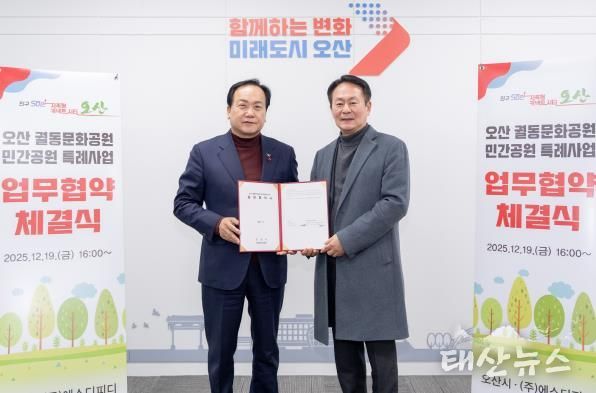태산뉴스 이동욱 기자 | 오산시는 12월 19일 오산시청에서 궐동문화공원 민간공원조성 특례사업의 원활한 추진을 위해 사업 시행자인 ㈜에스디피디와 협약을 체결했다.