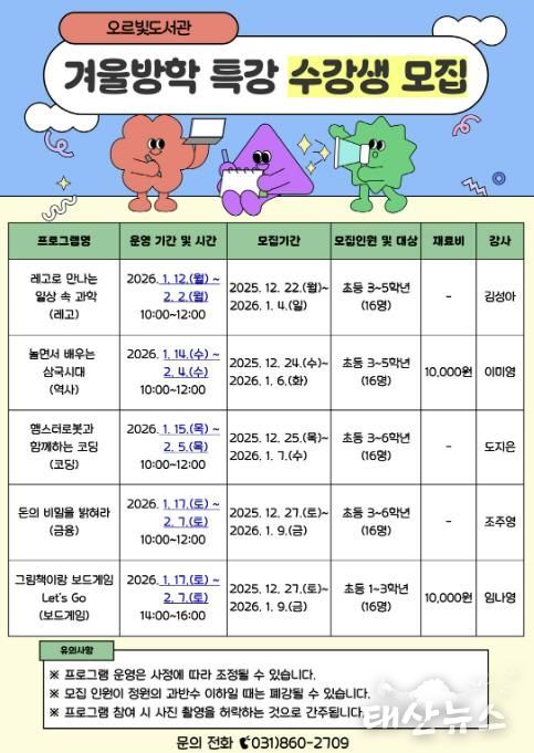 태산뉴스 이동욱 기자 | 동두천시 도서문화사업소 오르빛도서관은 겨울방학을 맞아 관내 초등학생이 다양한 주제를 흥미롭게 체험하며 사고력과 표현력을 키울 수 있는 겨울방학 특강 프로그램을 운영한다고 밝혔다.
