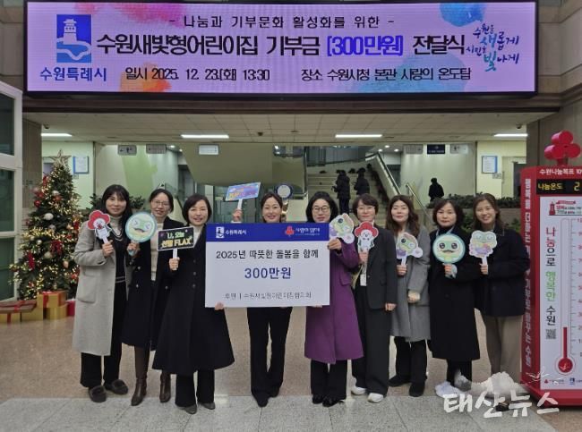 태산뉴스 이동욱 기자 | 수원새빛형어린이집협의회가 “어려움을 겪는 이웃에게 전달해달라”며 수원시에 300만 원을 기부했다. 전달식은 23일 수원시청 본관 사랑의 온도탑 앞에서 열렸다.