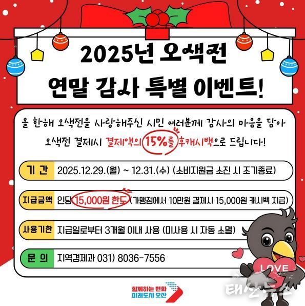 태산뉴스 이동욱 기자 | 오산시는 한 해 동안 지역화폐를 이용해 준 시민들에게 감사의 뜻을 전하고, 연말 소비 활성화를 도모하기 위해 ‘2025년 오색전 연말 감사 특별 이벤트’를 추진한다.