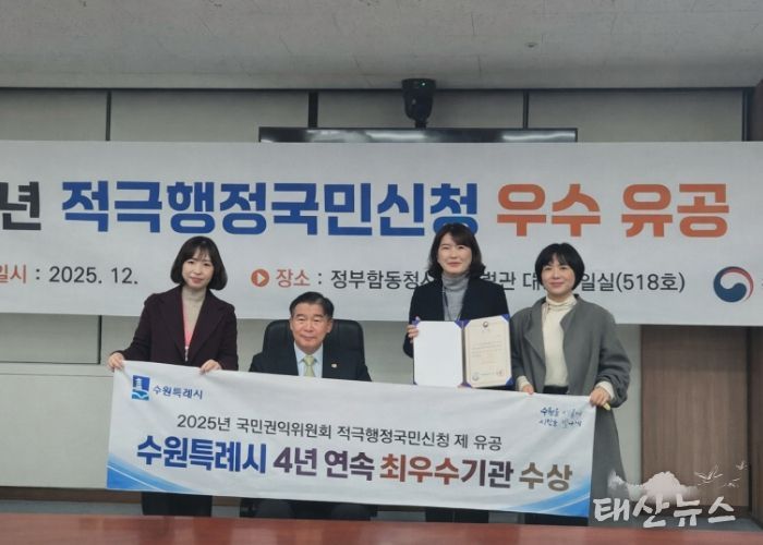 태산뉴스 이동욱 기자 | 수원특례시가 4년 연속 ‘국민권익위원회 적극행정국민신청제’ 우수기관으로 선정됐다.