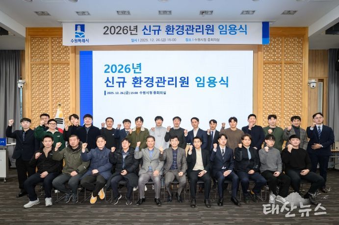 태산뉴스 이동욱 기자 | 수원특례시가 26일 시청 중회의실에서 2026년 신규 환경관리원 임용식을 열고, 신규 임용자 21명에게 임용장을 수여했다.