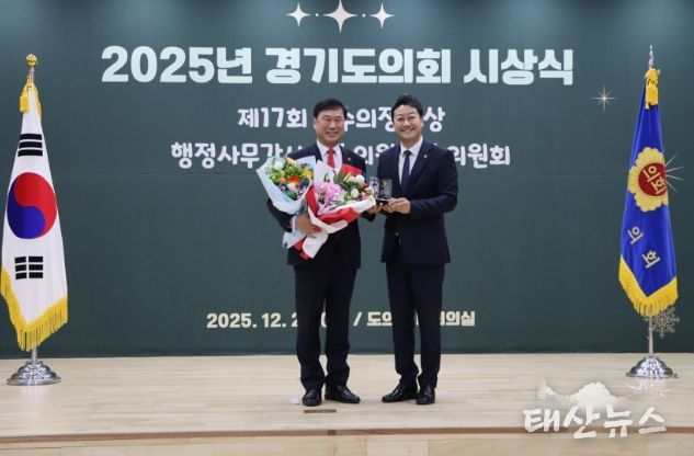 태산뉴스 김준수 기자 | 경기도의회 교육기획위원회 이택수 의원(국민의힘, 고양8)과 성기황 의원(더불어민주당, 군포2)이 26일 열린 2025년 경기도의회 시상식에서 ‘2025년 행정사무감사 우수위원’으로 선정됐다.
