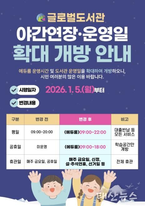 태산뉴스 이동욱 기자 | 의왕시 글로벌도서관(보식골로 30-10)이 시민들의 학습 편의 증진과 도서관 이용 활성화를 위해 2026년 1월 5일부터 도서관 이용 시간 야간 연장 및 공휴일 확대 운영을 실시한다.