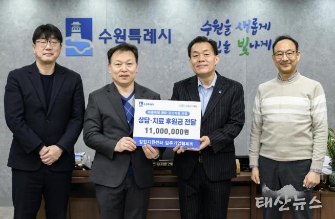 태산뉴스 이동욱 기자 | 수원시 창업지원센터 입주기업협의회가 “학대 피해아동 지원에 사용해 달라”며 수원시에 후원금 1100만 원을 전달했다. 전달식은 30일 이재준 수원시장 집무실에서 열렸다.