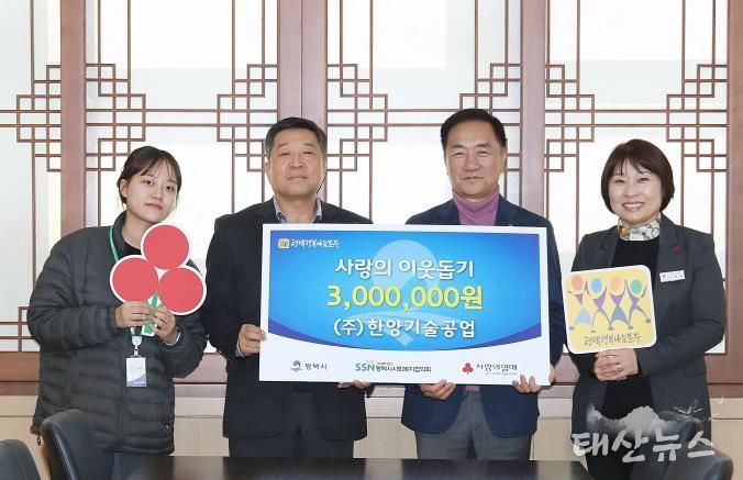 태산뉴스 이동욱 기자 | 평택시 서탄면에 있는 ㈜한양기술공업은 관내 취약계층 지원을 위한 성금 300만 원을 평택시청 대외협력실에서 평택행복나눔본부에 전달했다.