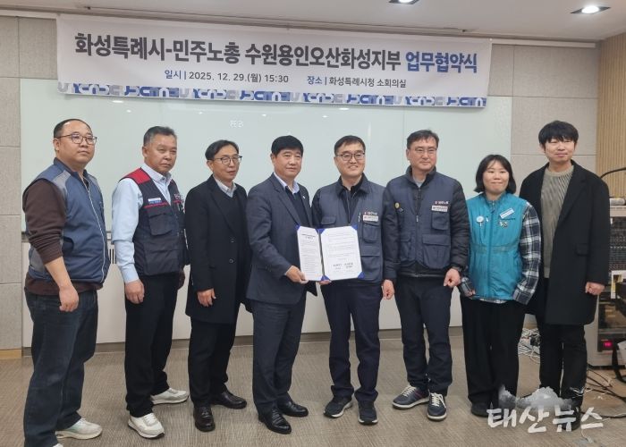 태산뉴스 이지율 기자 | 화성특례시가 지난 29일 민주노총 경기지역본부 수원용인오산화성지부와 ‘노정 협력을 위한 업무협약(MOU)’을 체결했다.
