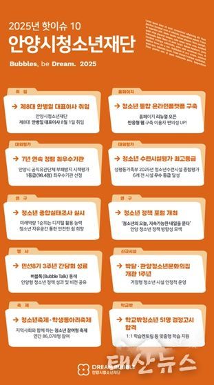 태산뉴스 이동욱 기자 | 안양시청소년재단은 올 한 해를 돌아보는 ‘2025년 안양시 청소년재단 핫이슈 10’을 선정하고, 2025년 청소년 정책 컨트롤타워로서의 기능을 강화해 청소년 체감형 정책 성과를 거뒀다고 30일 밝혔다.