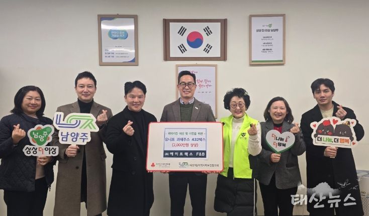 태산뉴스 이동욱 기자 | 남양주시는 30일 다산행정복지센터에서 ㈜에이트랙스 에프앤비가 지역 아동을 위한 과채주스 432박스를 전달했다고 밝혔다.