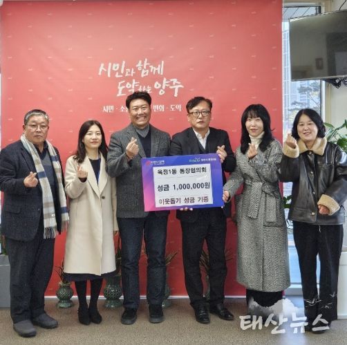 태산뉴스 이동욱 기자 | 옥정1동 통장협의회가 31일 지역 내 어려운 이웃을 돕기 위해 ‘이웃돕기 성금 100만 원’을 옥정1동에 기부했다. 기부금은 관내 취약계층과 복지 사각지대 가정 지원을 위해 사용될 예정이다.