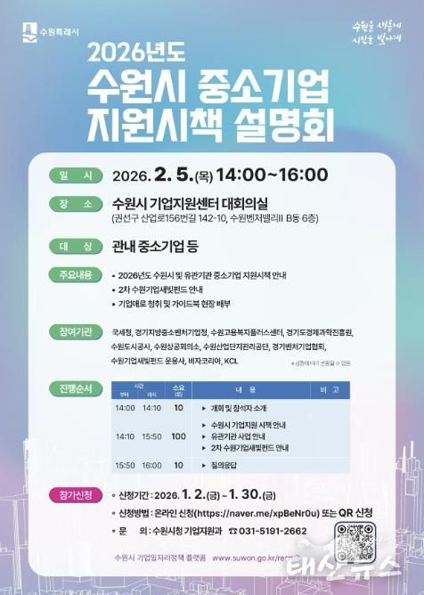 ‘2026년 중소기업 지원시책 설명회’는 2월 5일 오후 2시부터 4시까지 수원시 기업지원센터 대회의실에서 열린다.