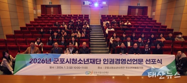 태산뉴스 이동욱 기자 | 군포시청소년재단은 2026년 1월 2일, 군포시청소년수련관 4층 청소년어울림 극장에서 전 직원 대상 인권경영 선언문 선포식을 개최했다. 이번 행사는 재단 임직원 모두가 참여하여, 새해를 맞아 조직 내 인권경영 실천 의지를 공유하고 상호 존중과 인권 존중의 문화를 강화하기 위해 마련됐다.