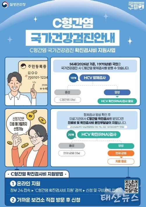 지원 대상은 56세 국가건강검진에서 C형간염 항체 양성판정을 받고 확진 검사(HCV RNA)를 받은 시민(2026년 기준 1970년생)으로, 확진 검사 시 수반되는 진찰료와 검사비 본인부담금을 최초 1회에 한해 최대 7만 원까지 지원한다.