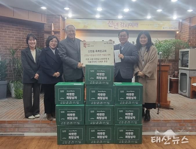 태산뉴스 이동욱 기자 | 시흥시 신천동 행정복지센터에 지난 1월 5일 신천동 축복된교회가 방문해 성탄 감사헌금 200만 원과 희망상자(식품꾸러미) 10개를 전달하며 지역사회에 이웃 사랑을 실천했다.
