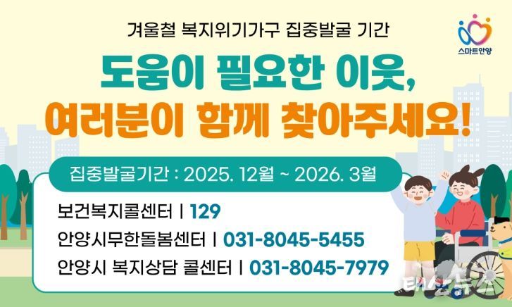 태산뉴스 이동욱 기자 | 안양시는 한파와 지속된 경기 침체에 대응해 오는 3월까지 복지서비스 접근이 어려운 취약계층을 적극 발굴하고 지원하는 ‘겨울철 복지위기가구 집중 발굴 기간’을 운영한다고 6일 밝혔다.